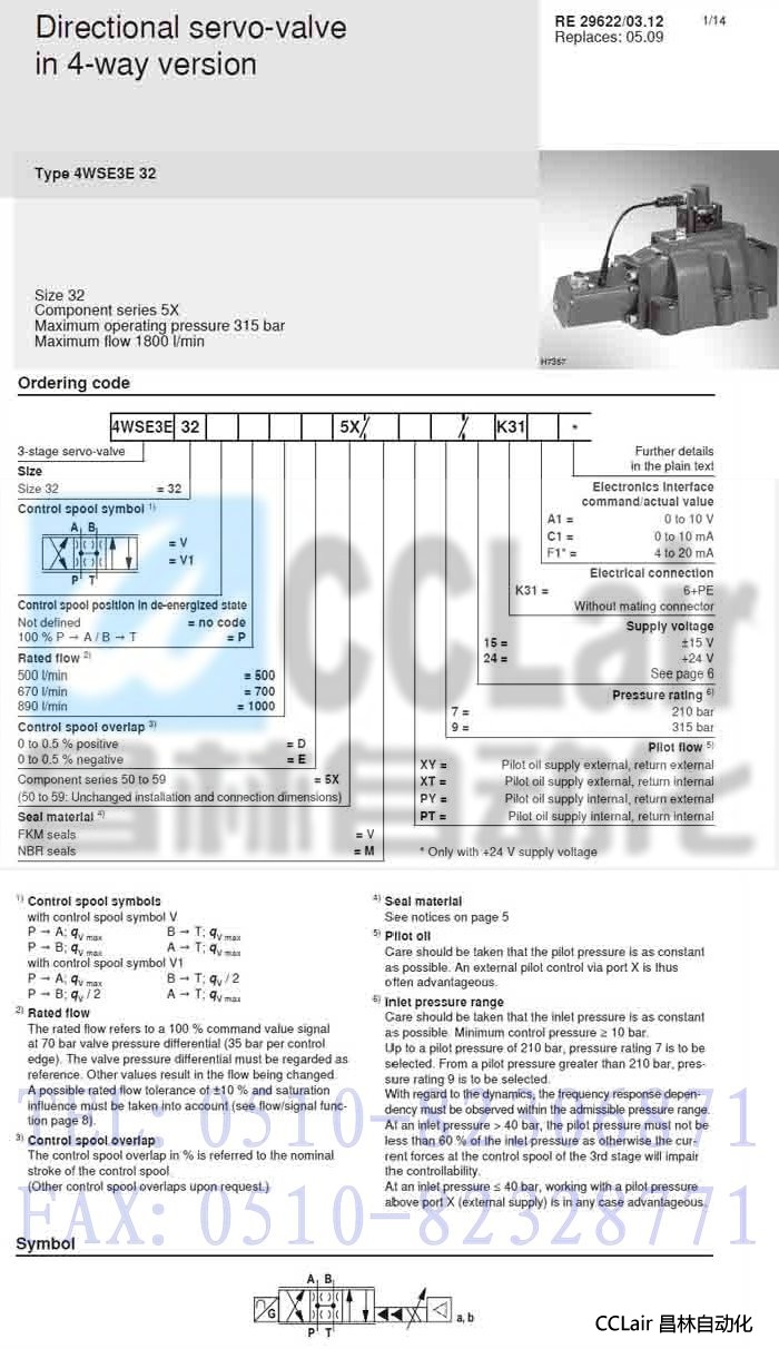 4WSE3E32V1000D5X/VXY9/24K31A1,4WSE3E32V1000D5X/VXY9/24K31C1, 方向伺服閥,力士樂REXROTH,德國力士樂 |