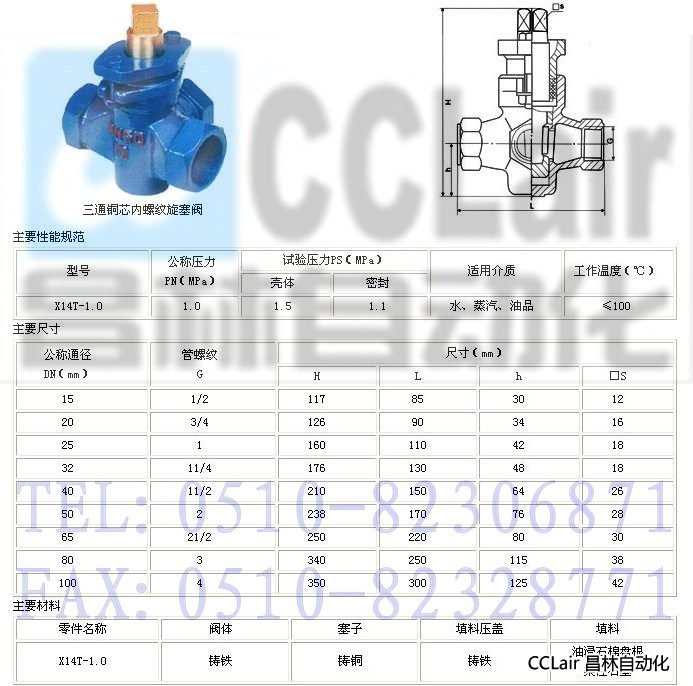X14T-1.0,三通銅芯內螺紋旋塞閥