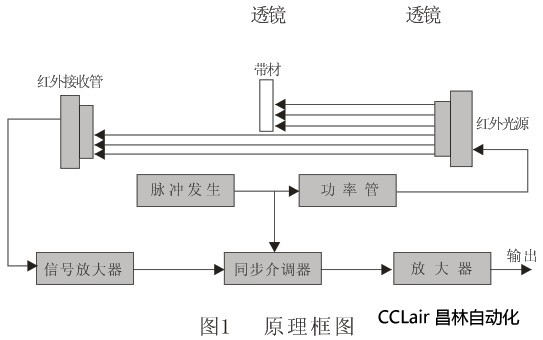 原理框見圖一,紅外光源發(fā)出高頻光脈沖,射出一束平行光,由紅外光敏接收管,接收并經(jīng)過信號放大器,轉(zhuǎn)變成電脈沖信號。當(dāng)光路上有帶材,遮擋時,光信號的強弱便發(fā)生變化,這個變化經(jīng)同步介調(diào)和放大后,變成電壓信號輸出。