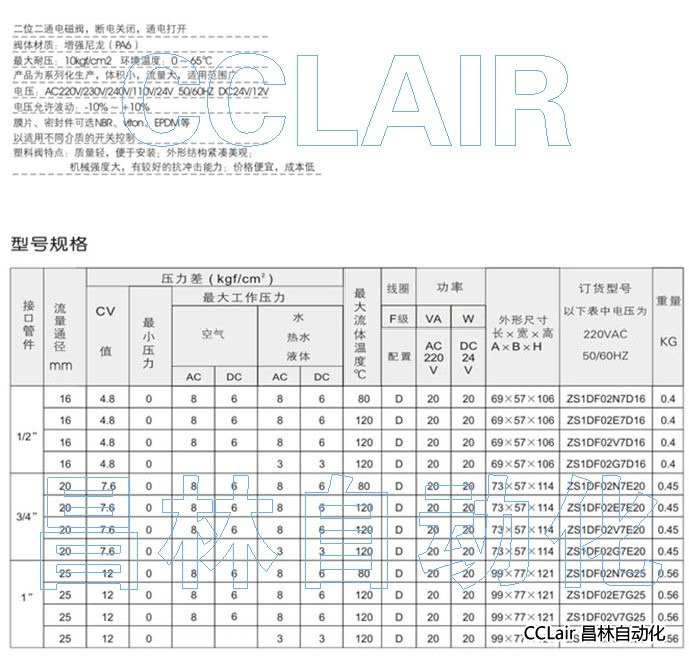 ZS1DF02N7D16,ZS1DF02E7D16,塑料二位二通零壓差電磁閥(常閉型)