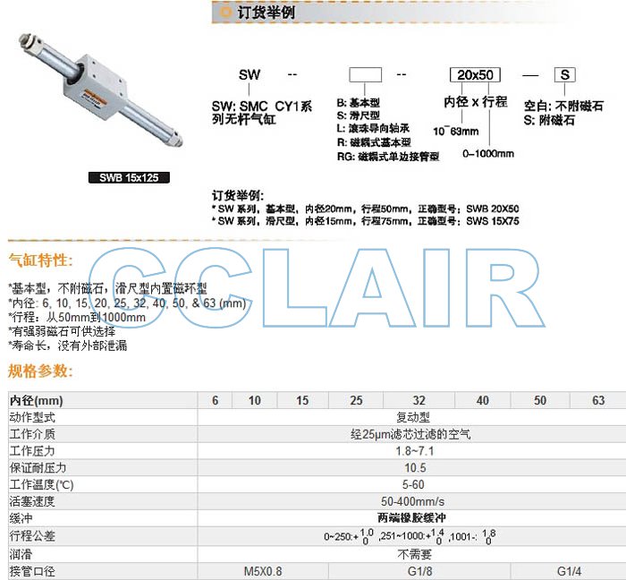 SWB6X50,SWS10X50,SWL15X50,SWR25X50,SWRG32X50,SWB40X50,SWB63X50,無桿氣缸