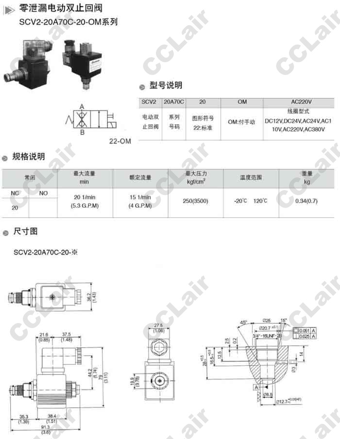 SCV2-20A70C-20-OM-DC12V,SCV2-20A70C-20-OM-DC24V,SCV2-20A70C-20-OM-AC24V,零泄漏電動(dòng)止回閥