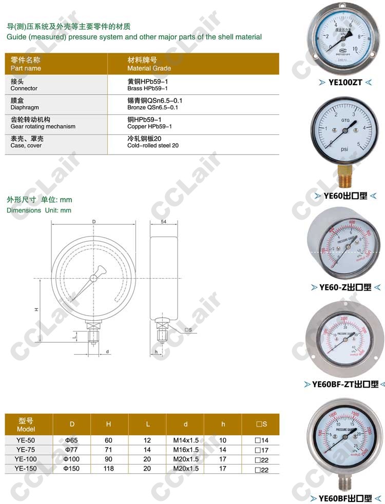 YE-50,YE-75,YE-60,YE-60ZT,YE-100,YE-150,膜盒壓力表,無錫昌林