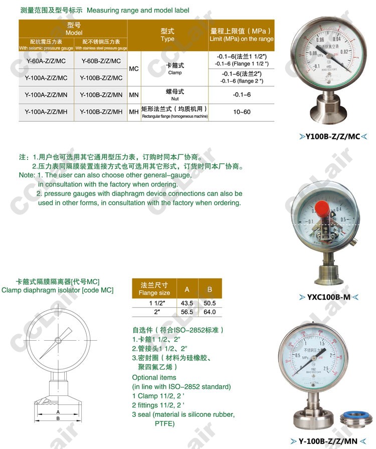 Y-60A-Z/ZMC,Y-100A-Z/ZMC,Y-100A-Z/ZMN,Y-100A-Z/ZMH,衛(wèi)生型隔膜壓力表 |