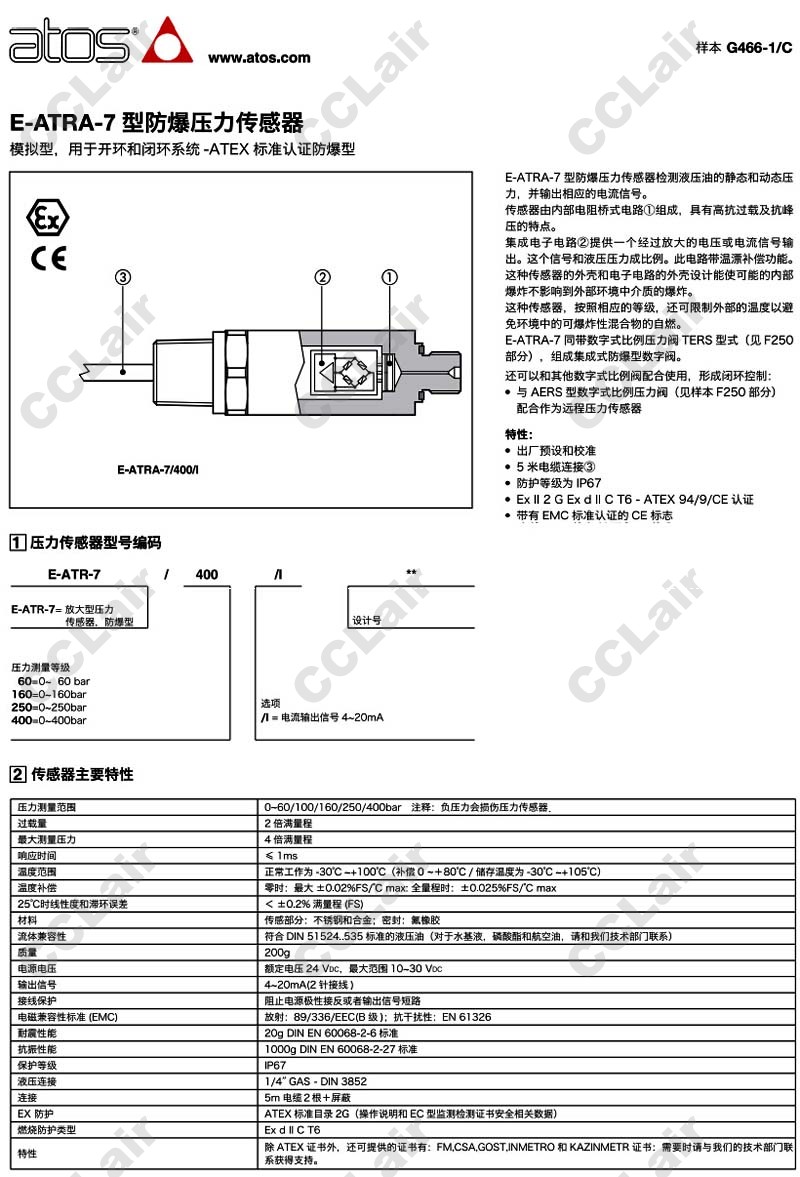 E-ATRA-7/60,E-ATRA-7/100,E-ATRA-7/160,E-ATRA-7/250,E-ATRA-7/400,阿托斯ATOS防爆壓力傳感器