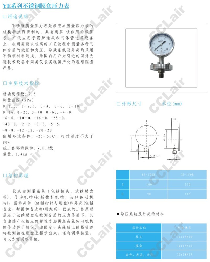 YE-100B,YE-150B,不銹鋼膜盒壓力表,CCLair