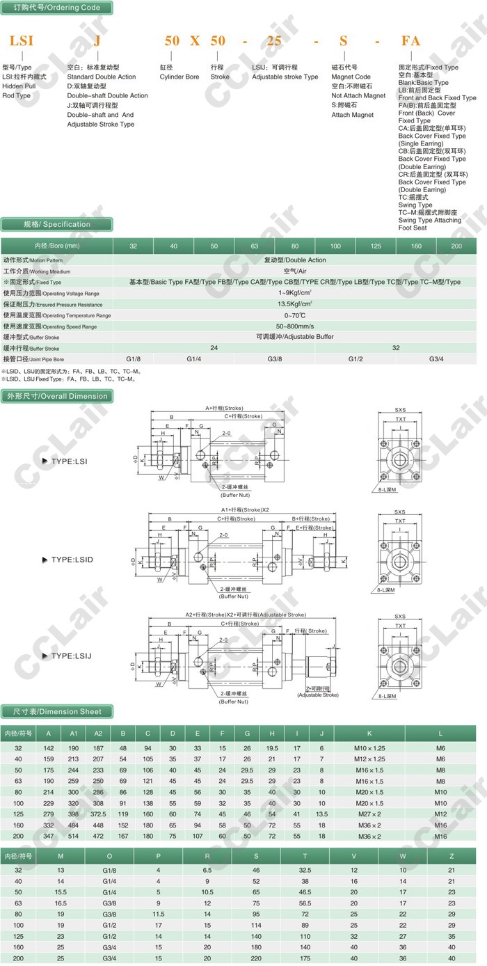 LSI32,LSI40,LSI50,LSI63,LSI80,LSI100,LSI125,LSI150,LSI200,LSI200×50,LSI50×50,標準氣缸