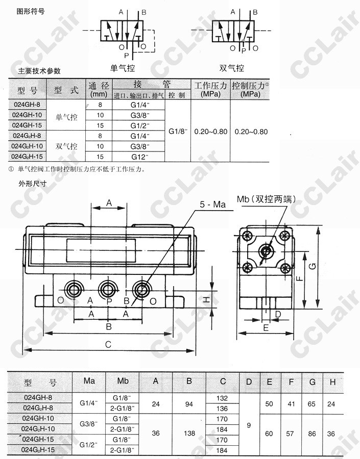024GH-8,024GH-10,024GH-15,024G2H-8,024G2H-10,024G2H-15,二位四通氣控?fù)Q向閥