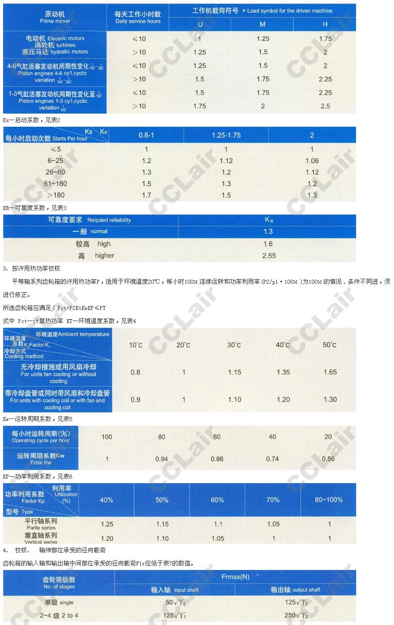 平等軸系列齒輪箱的公稱輸入功率PA(表9—20)按載荷平穩(wěn),每天工作時(shí)間小于或等于10h,每小時(shí)啟動不超過5次,允許啟動轉(zhuǎn)矩為工作轉(zhuǎn)矩的2倍,單向運(yùn)轉(zhuǎn),單對齒輪的接觸強(qiáng)度安全系數(shù)約為1,失效率概率小于或等于1%等條件計(jì)算確定的。齒輪箱雙向運(yùn)轉(zhuǎn)時(shí),需視情況將PN乘上0.8—1.0的系數(shù),當(dāng)反向載荷大,換向頻繁、選用的可靠度系數(shù)KR較低時(shí),系數(shù)取較小值,反之取較大值。