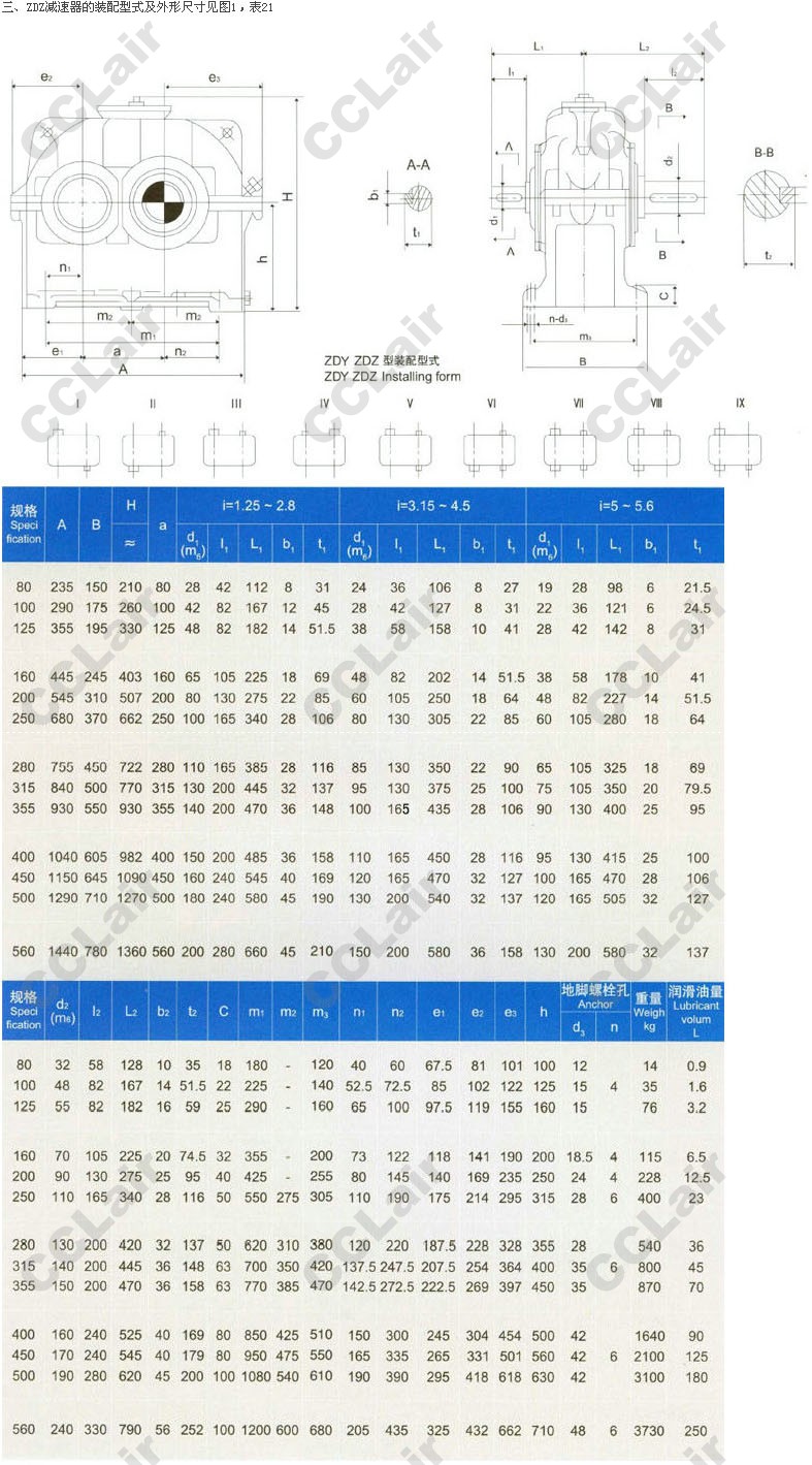 三、ZDZ減速器的裝配型式及外形尺寸見圖1,表21