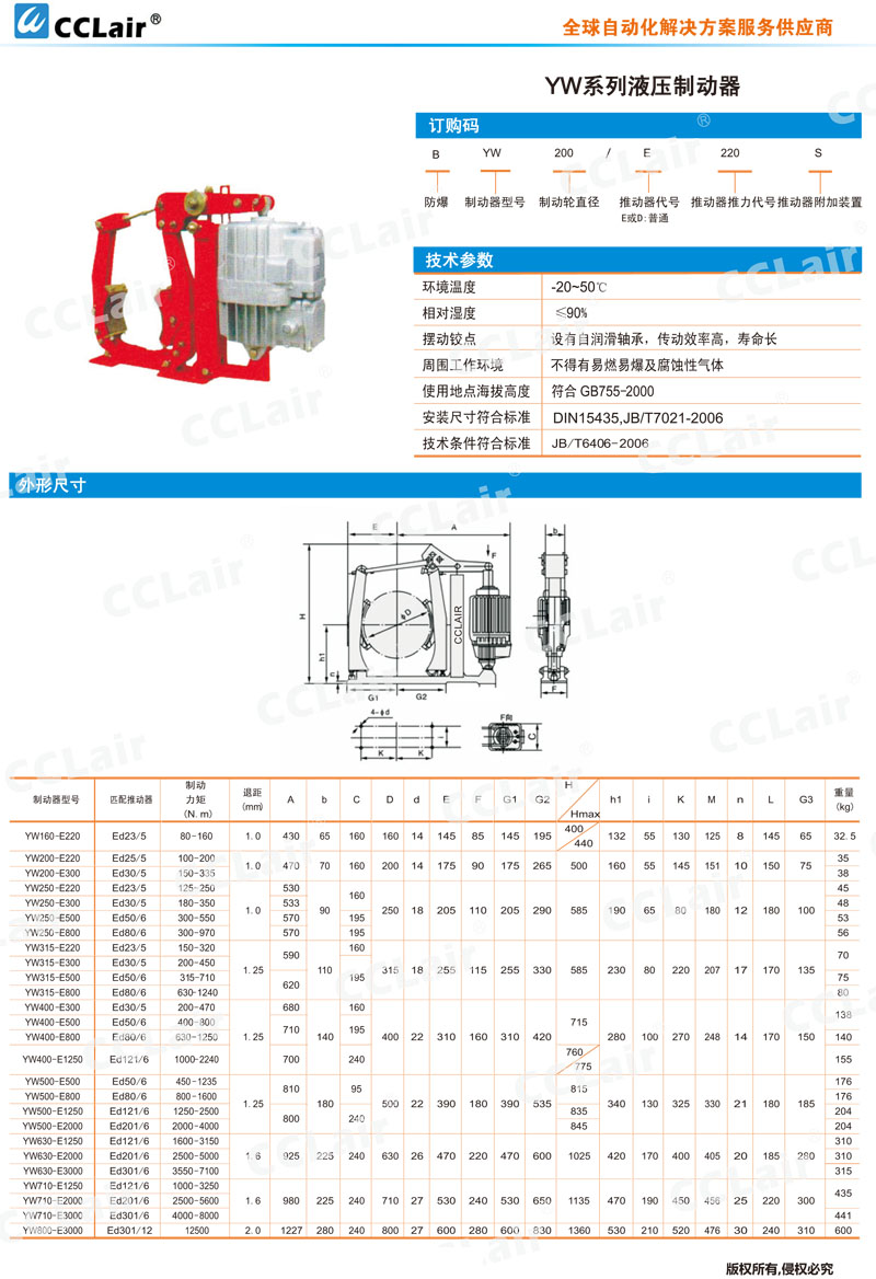 YW160,YW200,YW250,YW315,YW400,YW500,YW630,YW710,YW800,YW630-E3000,BYW630-E3000,液壓制動器
