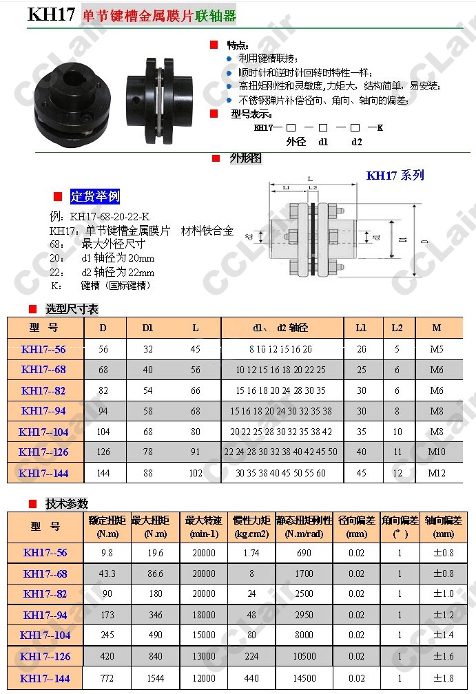 KH17-56,KH17-68,KH17-82,KH17-94,KH17-104,KH17-126,KH17-144,單節(jié)鍵槽金屬膜片聯(lián)軸器