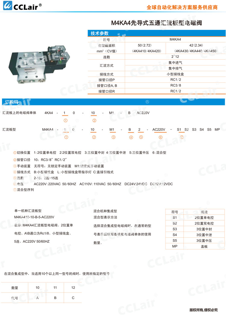 M4KA410-10,M4KA420-10,M4KA430-10,M4KA440-10,M4KA450-10,先導(dǎo)式五通匯流板型電磁閥