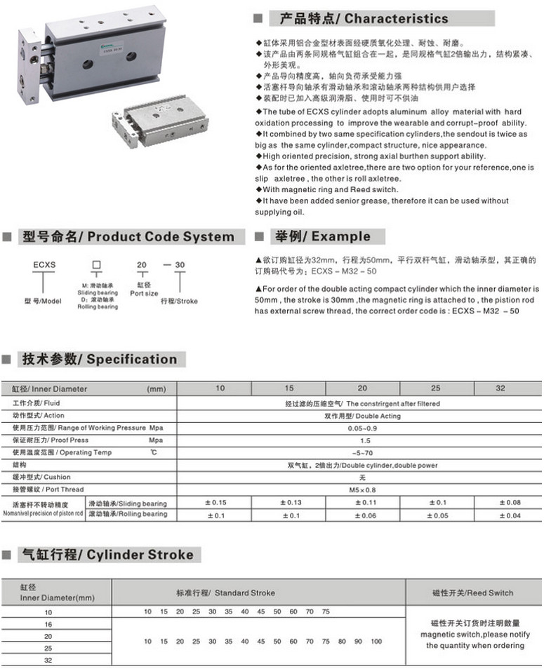 ECXSM10-10,ECXSM16-20,ECXSM20-25,ECXSM25-30,ECXSM10-50,ECXSM16-70,平行雙桿氣缸