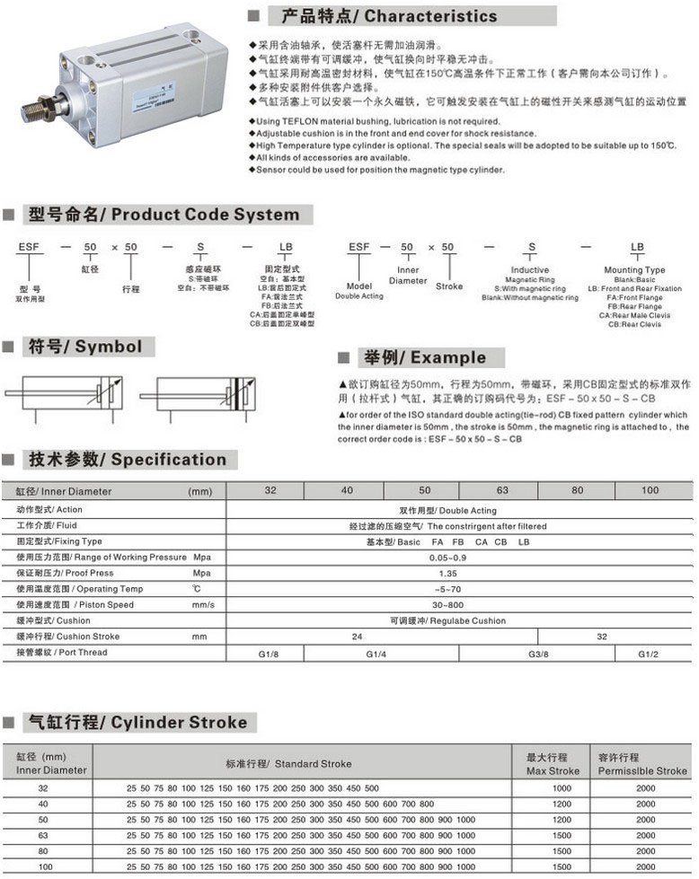 ESF-32*25-S,ESF-40*50-S,ESF-50*75-S,ESF-63*80-S,ESF-80*100-S,標(biāo)準(zhǔn)氣缸