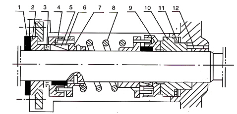 雙機(jī)械密封裝置主要由墊圈(1)內(nèi)靜環(huán)(2)動環(huán)(3)動環(huán)體(4)密封圈(5)(6)推環(huán)(7)彈簧(8)動環(huán)(9)外靜環(huán)(10)靜環(huán)密封圈(11)防轉(zhuǎn)銷(12)等主要零件組成。