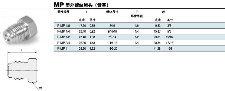 P-MP1/8,P-MP1/4,P-MP1/2,P-MP3/4,P-MP1,外螺紋堵頭