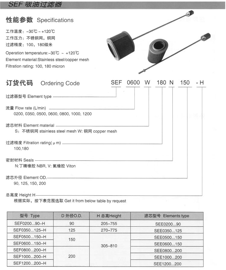 SEF0200,SEF0350,SEF0500,SEF0600,SEF0800,SEF1000,SEF1200,SEF0800W180N200-H,吸油過濾器