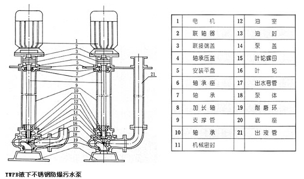 8、防爆型液下排污泵有單管安裝和雙管安裝兩種,支承件有圓盤和方盤安裝,適合不同需要。
