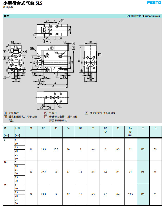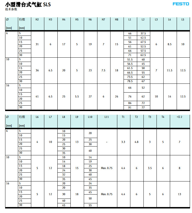 SLS-6-5,SLS-10-5,SLS-16-5,SLS-6-10,SLS-10-10,SLS-16-10,festo小型滑臺(tái)式氣缸