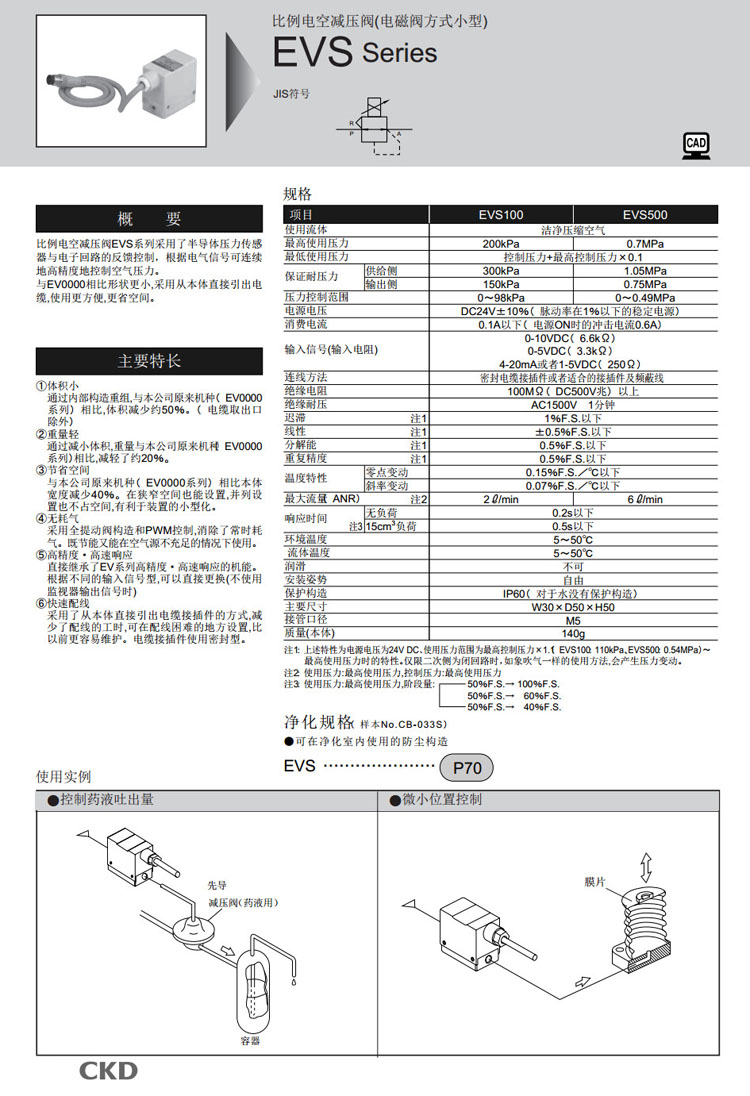 EVS100-0M5,EVS100-1M5,EVS100-2M5,EVS500-0M5,EVS500-1M5,EVS500-2M5,CKD比例電控減壓閥