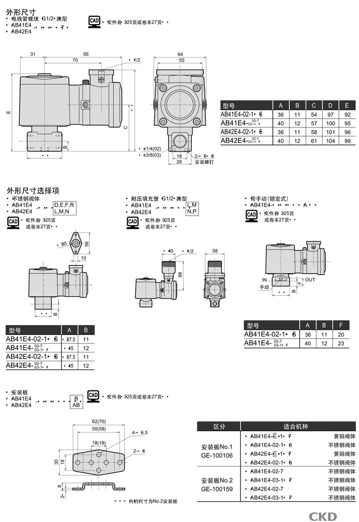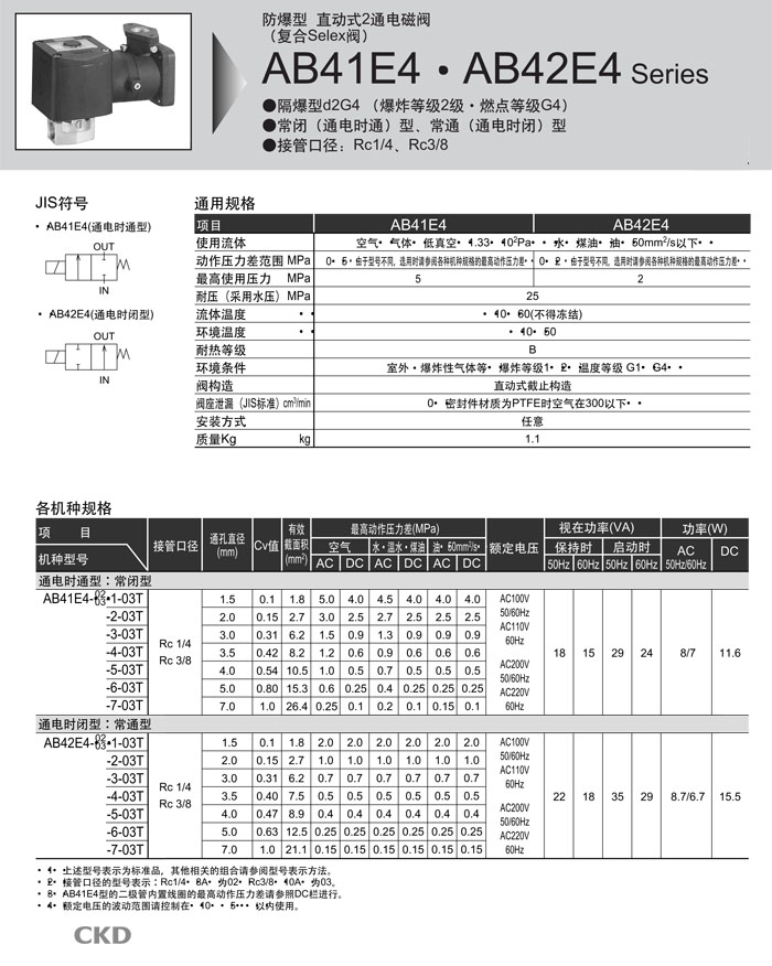 AB41E4-02-1,AB41E4-03-1,AB41E4-02-2,AB41E4-03-2,AB41E4-02-3,AB41E4-03-3,CKD直動(dòng)式2通電磁閥