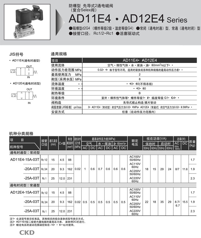 AD11E4-15A,AD11E4-20A,AD11E4-25A,AD12E4-15A,AD12E4-20A,AD12E4-25A,CKD先導(dǎo)式2通電磁閥
