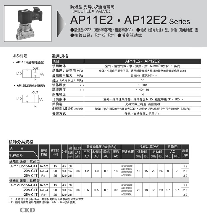 AP11E2-15A,AP11E2-20A,AP11E2-25A,AP12E2-15A,AP12E2-20A,AP12E2-25A,CKD先導(dǎo)式2通電磁閥