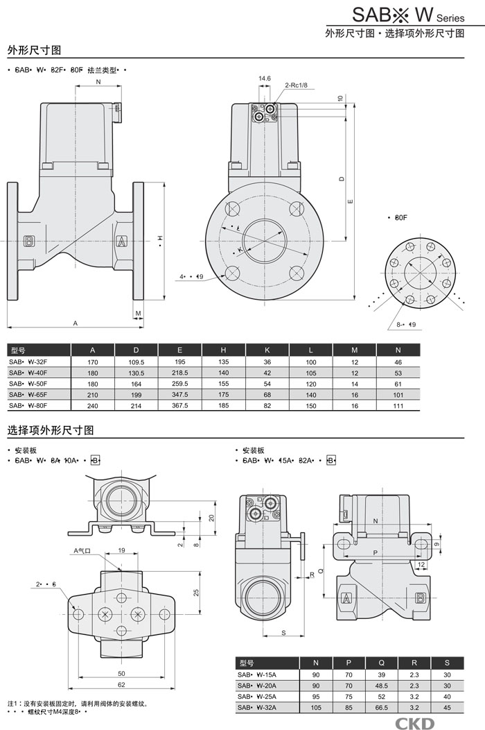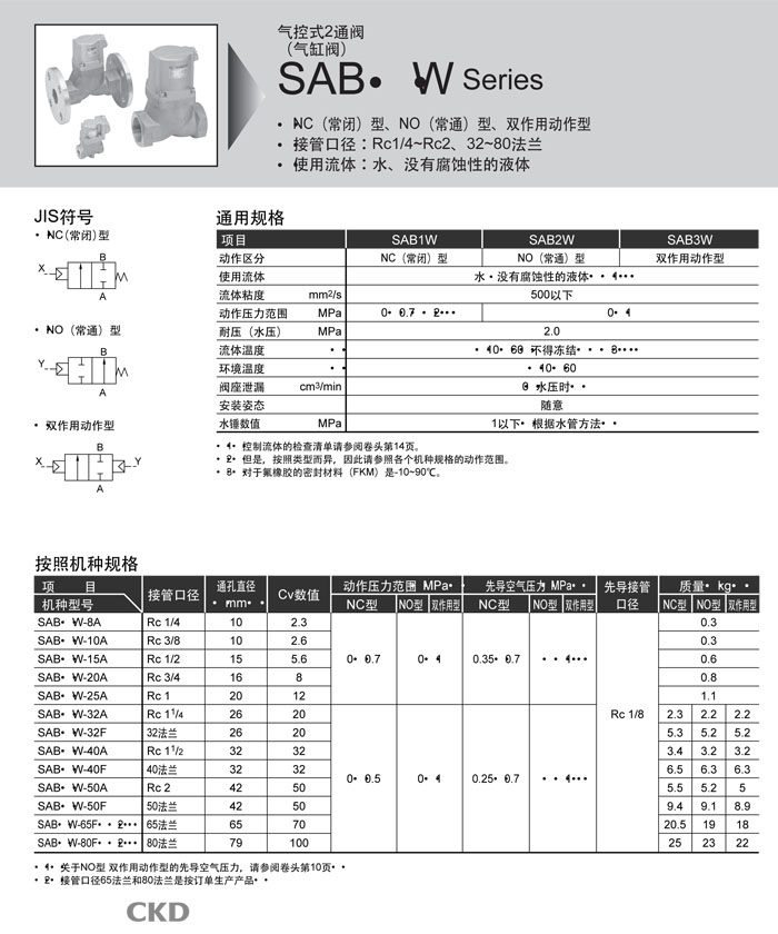 SAB1W-8,SAB1W-10,SAB1W-15,SAB1W-20,SAB1W-25,SAB1W-32,SAB1W-40,SAB1W-65,SAB1W-80,CKD氣控式2通閥