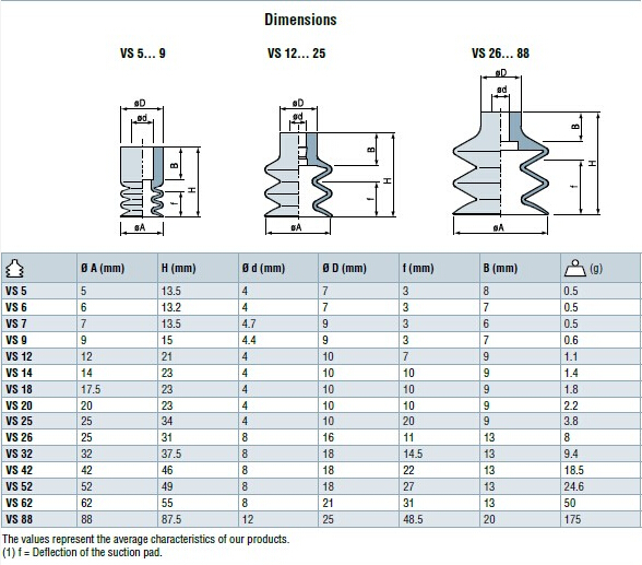 VS系列波紋管吸盤,波紋形2.5褶,Ø5 - 88mm,材料:丁腈橡膠(NBR),天然橡膠(NR),半透明硅膠(SIT5),Siton(STN)。 主要參數(shù)見下表: