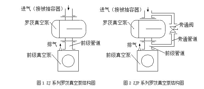 二、ZJ系列羅茨真空泵在較低入口壓力時(shí)具有較高的抽氣速率,但它不能單獨(dú)使用,必須有一臺(tái)前級(jí)真空泵串聯(lián),待被抽系統(tǒng)中的壓力被前級(jí)真空泵抽到羅茨真空泵允許的入口壓力時(shí),羅茨真空泵才開始工作(見圖1)。
