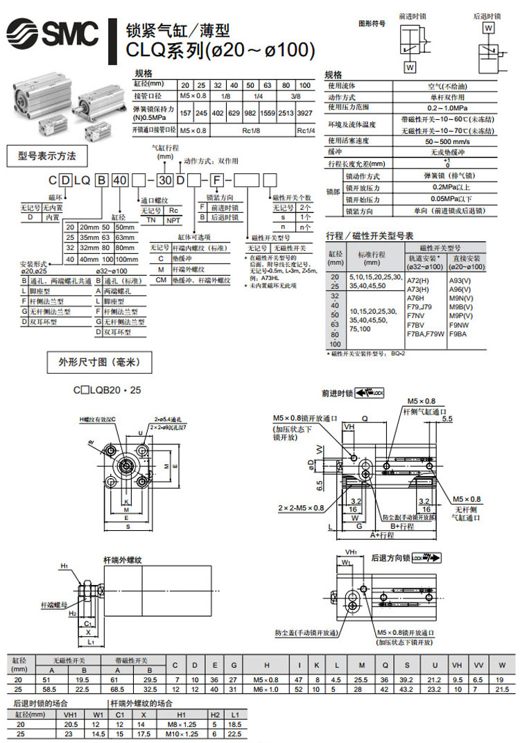 CLQB20-5D,CLQL20-5D,CLQF20-5D,CLQG20-5D,CLQD20-5D,CLQA32-10D,SMC薄型鎖緊氣缸