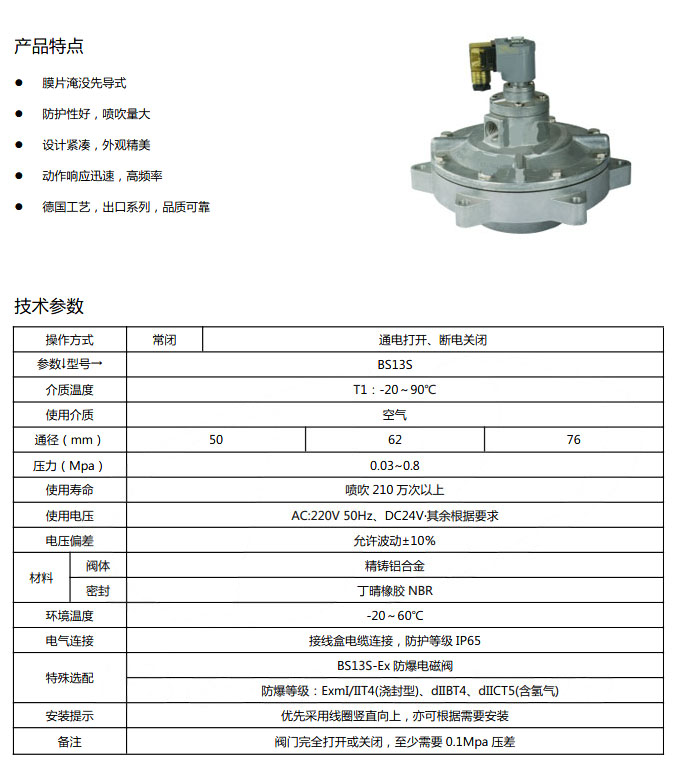BS13S-DN50,BS13S-DN62,BS13S-DN76,膜片先導(dǎo)淹沒式脈沖電磁閥