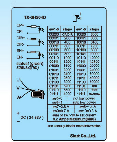 TX-3H504D型驅(qū)動器,主要用于驅(qū)動57型或者低壓低速86型三相混合式電機。其運行步數(shù)(細分數(shù))達到28類,最大步數(shù)6萬,通過撥位開關(guān)的第1-5位來設(shè)定步數(shù)。具有單雙脈沖方式,自測試功能,相位記憶功能,自動半電流功能。本驅(qū)動器可以輸出的最大電流為5.2A(有效值),可以很方便的通過撥位開關(guān)的第7-10位來設(shè)定你需要的輸出電流(可以設(shè)定16檔電流,設(shè)定分辨率0.3A)。本驅(qū)動器為直流供電,下限值DC24V,上限值DC36V,典型值DC24V或32V,建議使用開關(guān)電源供電,其供電功率不小于100W.