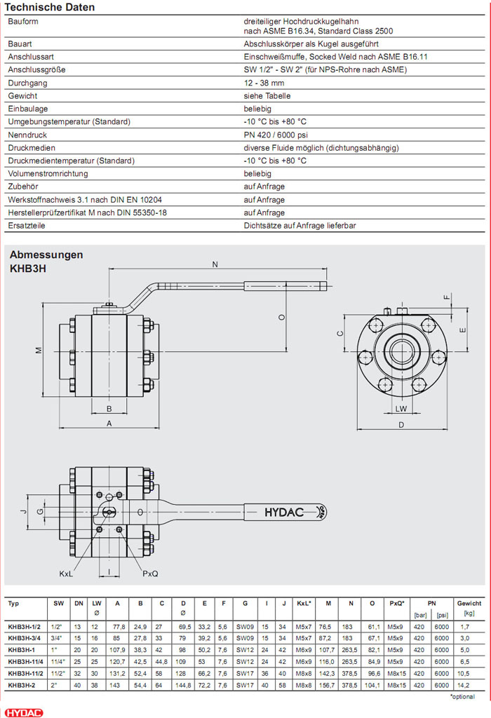 KHB3H-1/2,KHB3H-3/4,KHB3H-1,KHB3H-11/4,KHB3H-11/2,KHB3H-2,HYDAC 2路高壓球閥