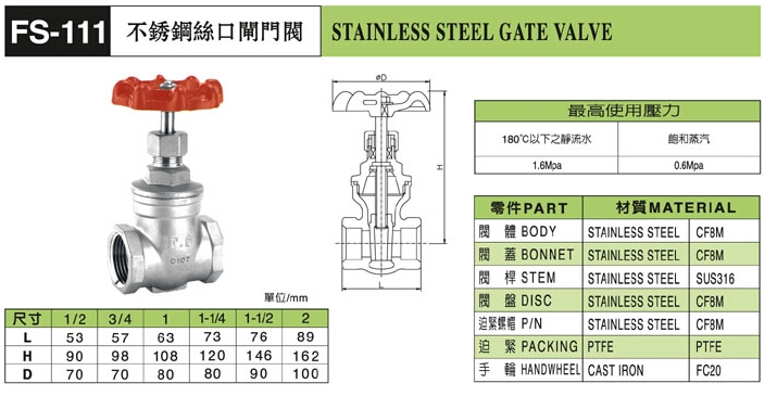 FS-111不銹鋼絲口閘閥硅溶膠鑄造閥體,工藝美觀,標(biāo)準(zhǔn)304材質(zhì),無銹斑,美國(guó)保險(xiǎn)業(yè)UL認(rèn)證。富山絲扣閘閥的啟閉件是塞形的閥瓣,密封面呈平面或錐面,閥瓣沿流體的中心線作直線運(yùn)動(dòng)。閥桿的運(yùn)動(dòng)形式,有升降桿式(閥桿升降,手輪不升降),也有升降旋轉(zhuǎn)桿式(手輪與閥桿一起旋轉(zhuǎn)升降,螺母設(shè)在閥體上)。紋管截止閥只適用于全開和全關(guān),不允許作調(diào)節(jié)和節(jié)流。