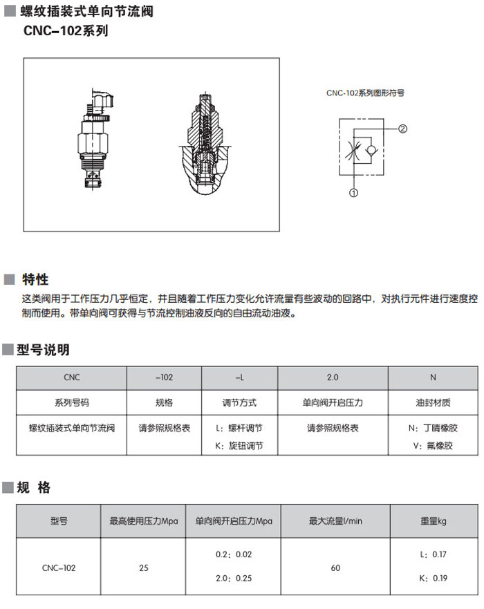 CNC-102-L2.0N,CNC-102-L0.2N,CNC-102-K2.0N,CNC-102-K0.2V,CNC-102-L2.0V,螺紋插裝式單向節(jié)流閥