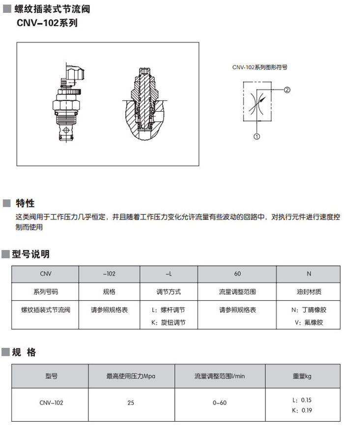 CNV-102-L60N,CNV-102-L60V,CNV-102-K60N,CNV-102-K60V,螺紋插裝式節(jié)流閥