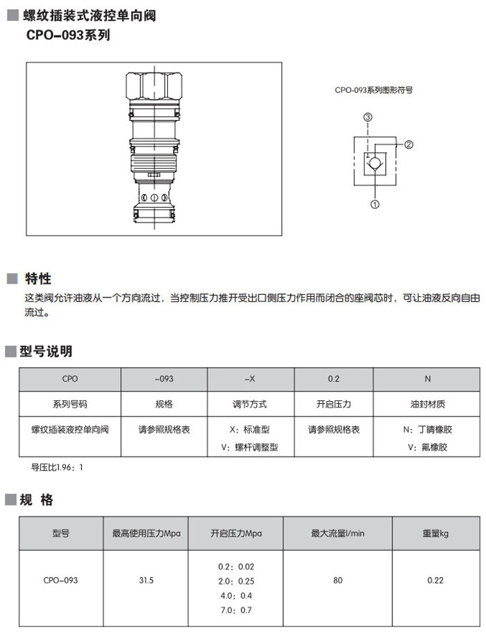 CPO-T02-X0.2N,CPO-T02-X2.0N,CPO-T02-X4.0N,CPO-T02-X7.0N,CPO-T02-X0.2V,螺紋插裝式液控單向閥