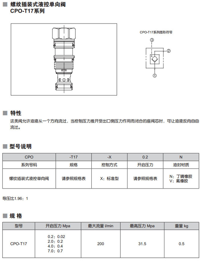 CPO-T17-X0.2N,CPO-T17-X2.0N,CPO-T17-X4.0N,CPO-T17-X7.0N,CPO-T17-X0.2V,螺紋插裝式液控單向閥