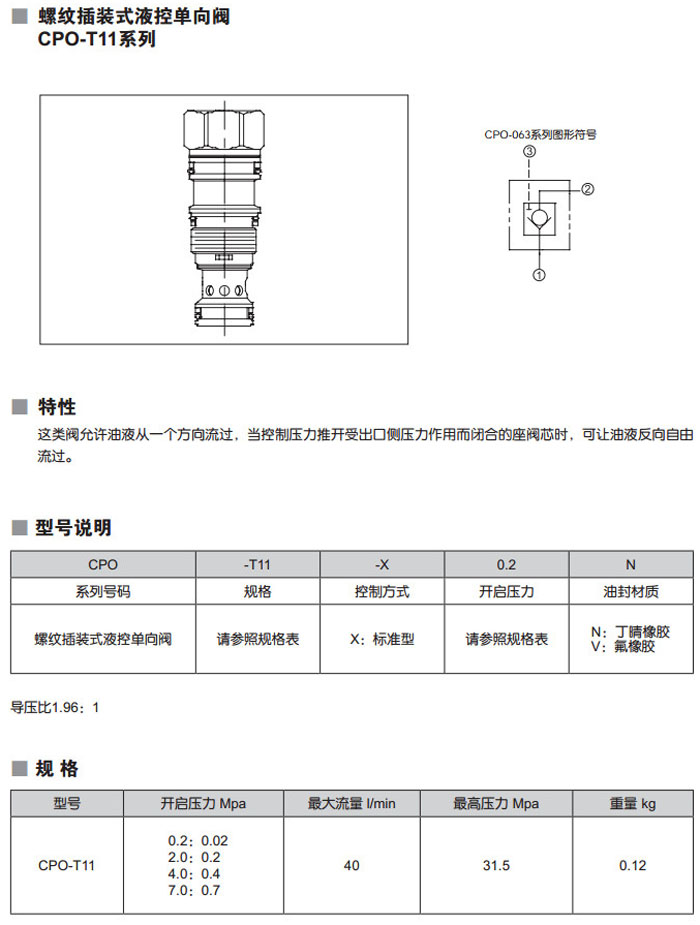 CPO-T11-X0.2N,CPO-T11-X2.0N,CPO-T11-X4.0N,CPO-T11-X7.0N,CPO-T11-X0.2V,螺紋插裝式液控單向閥