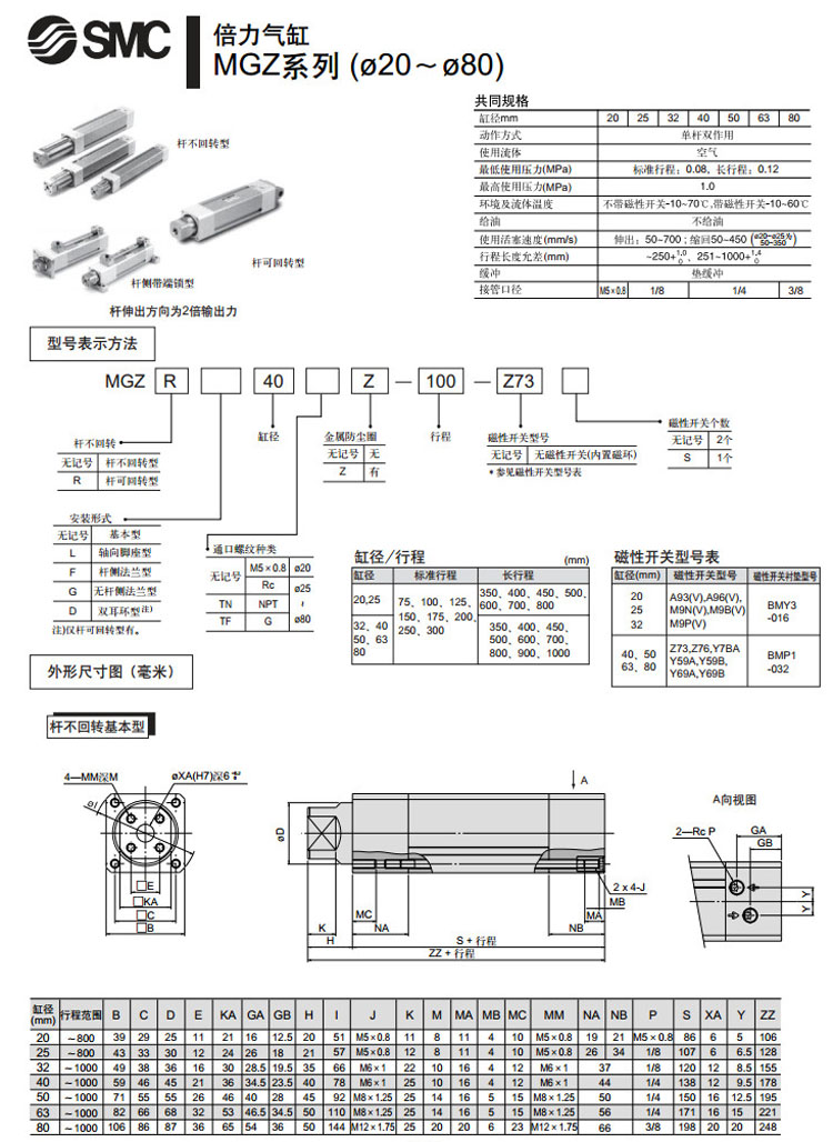 MGZ20,MGZ25,MGZ32,MGZ40,MGZ50,MGZ63,MGZ80,MGZ20-75,MGZ20Z-75,SMC桿不回轉(zhuǎn)倍力氣缸