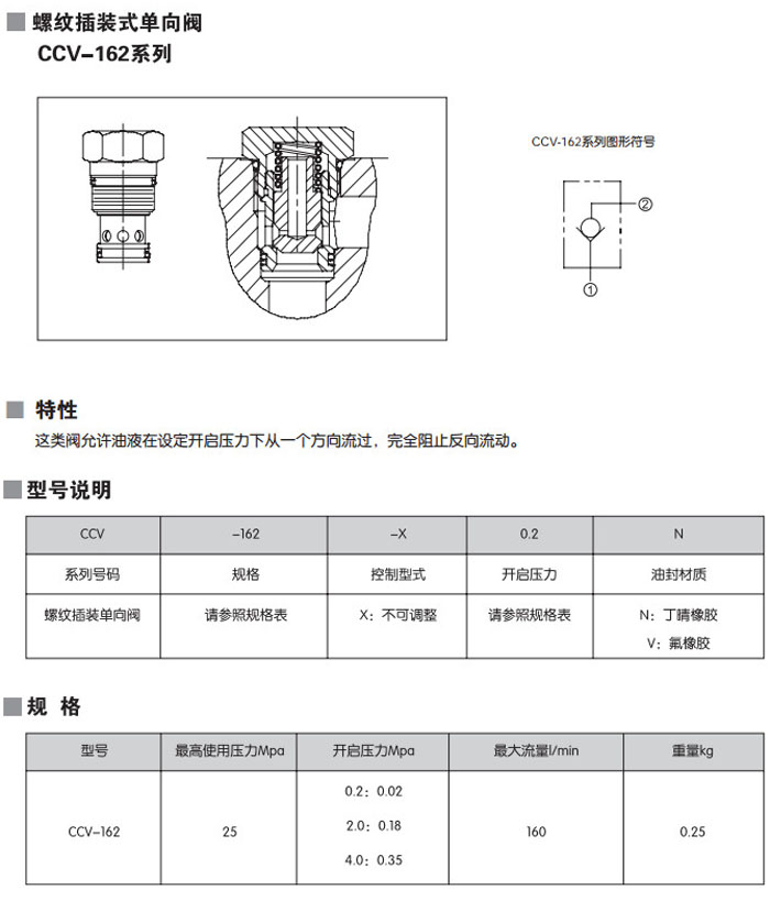 CCV-162-X0.2N,CCV-162-X2.0N,CCV-162-X4.0N,CCV-162-X0.2V,CCV-162-X2.0V,CCV-162-X4.0V,螺紋插裝式單向閥