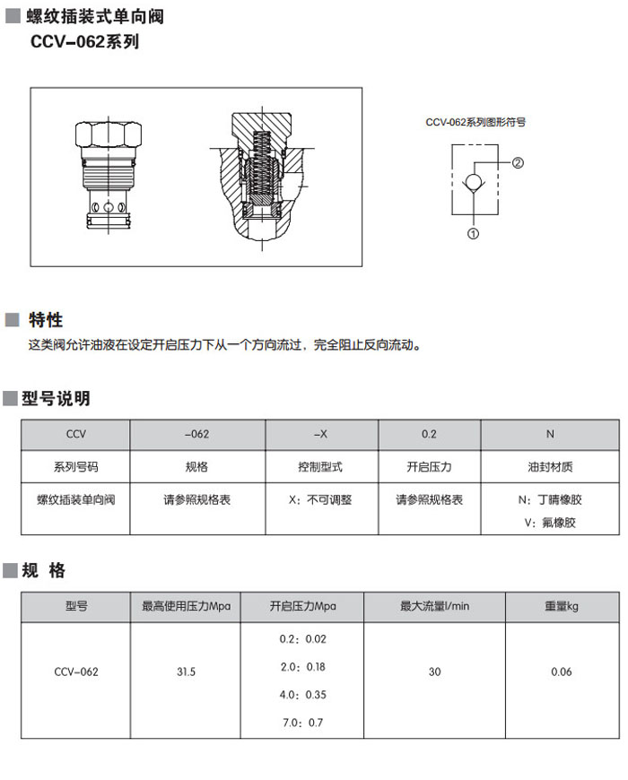CCV-062-X-0.2N,CCV-062-X-2.0N,CCV-062-X-4.0N,CCV-062-X-7.0N,CCV-062-X-0.2V,螺紋插裝式單向閥